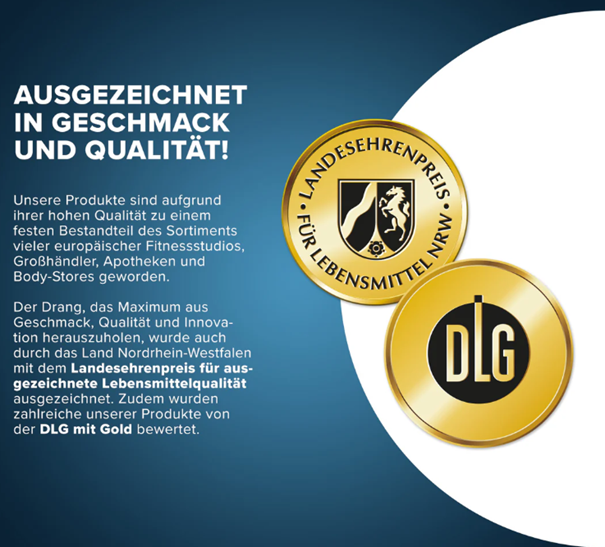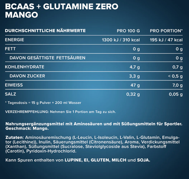 Egy adag, optimális arányú 2:1:1 BCAA-t és 1000 mg glutamint tartalmaz. Ezen kívül 2 mg B6-vitamin is található benne, amely a tápanyag-referenciaértékek 143%-ának felel meg (NRV (az 1169/2011. Számú VO (EG) szerint) = a tápanyag-referenciaértékek %-a)
