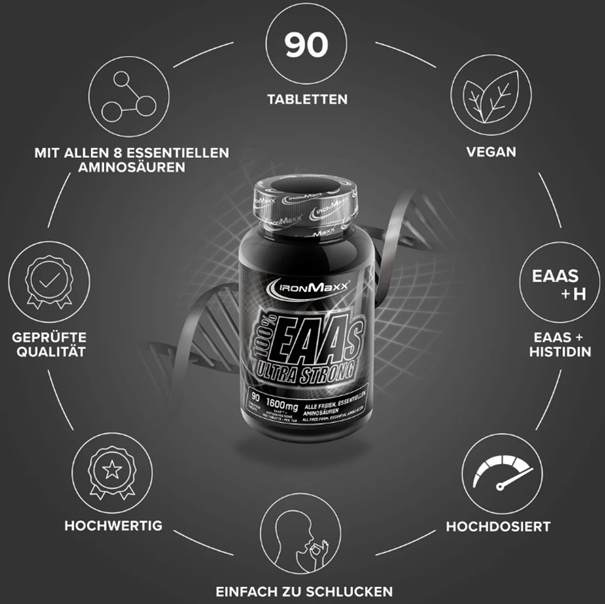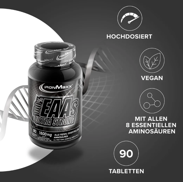 A 100% EAAS Ultra Strong tabletta – IronMaxx®, azon testépítők, ill. élsportolók számára ajánlott, akik 100%-os teljesítményt tűztek ki célként maguk elé! A szervezet számára gyorsan felhasználható, magas koncentrációjú EAAs aminosavakat tartalmaz, praktikus tabletták formájában.