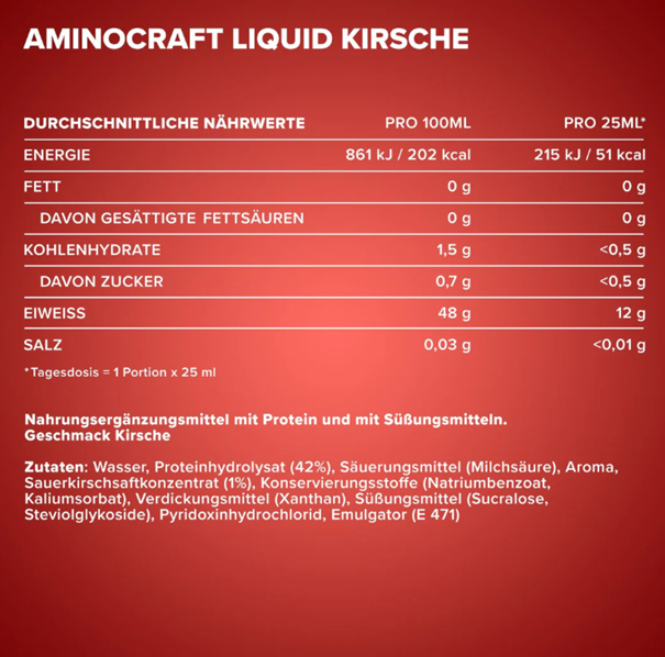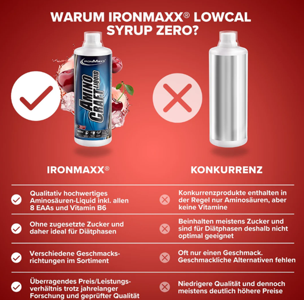 Egy különleges receptúrának köszönhetően az AminoCraft Liquid 1000ml – IronMaxx® magas fehérjetartalmú. Az íztől függően 100 ml aminosavban 48 g fehérjét biztosítunk folyékony formában. Az AminoCraft Liquid 1000ml – IronMaxx® segít a napi fehérjeszükséglet fedezésében, hogy pozitív hatásokat érhessen el az edzéssel. A fehérjék segítenek fenntartani és növelni az izomtömeget, valamint fenntartani a normál csontozatot. A tömegnövelési fázisok mellett diétás fázisokban is használható, mivel nem adtak hozzá további cukrot ehhez a termékhez. A cukortartalma is nagyon alacsony. Az alacsony cukortartalom ellenére az AminoCraft Liquid 1000ml – IronMaxx® kiváló ízű.