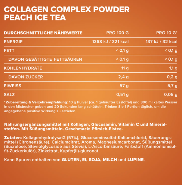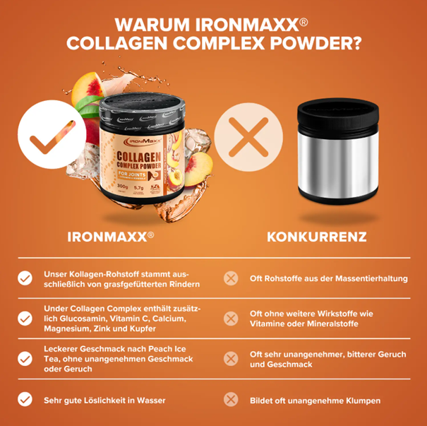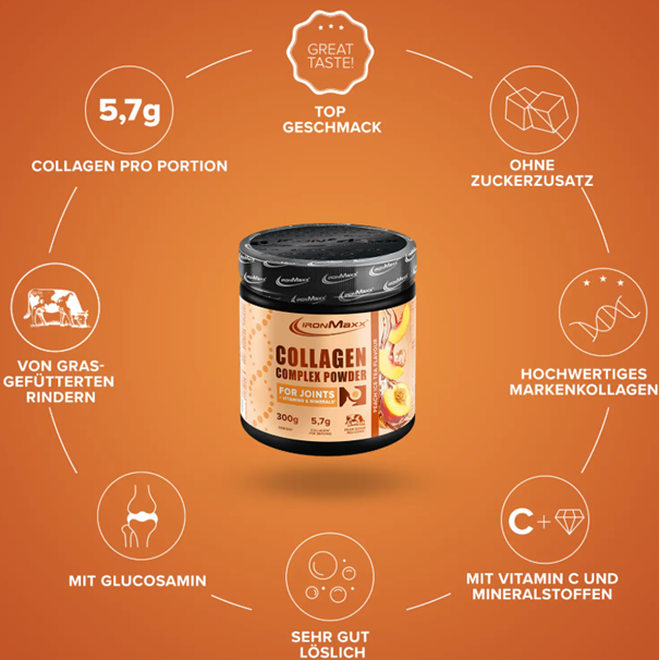 A Collagen Complex Powder 300 g IronMaxx® egy teljesen új wellness élményében a frissítő őszibarack jeges tea ízével! Ez az egyedülálló kombinációja a fűvel táplált szarvasmarhákból származó, kiváló minőségű kollagénnek és a gondosan válogatott tápanyagoknak.