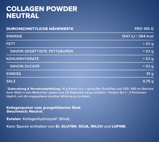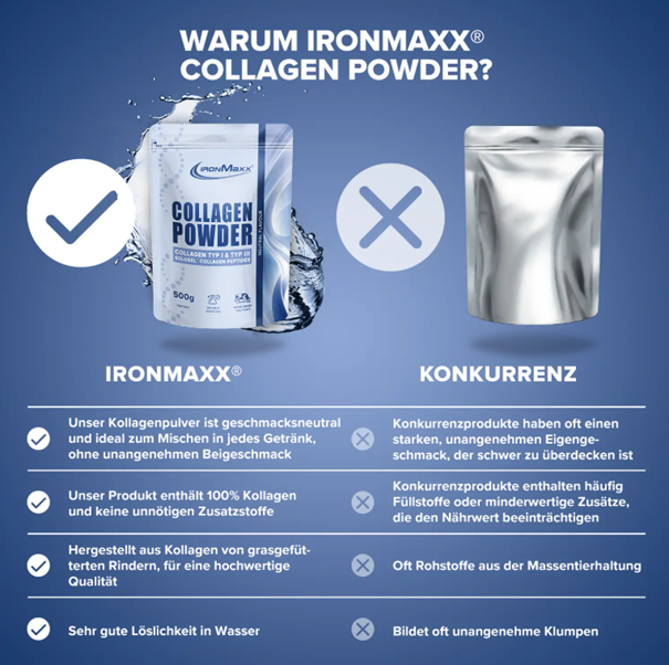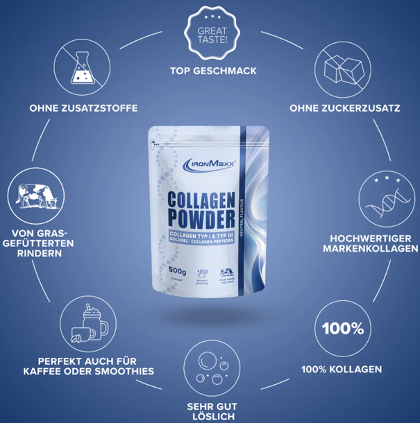 Mivel a Collagen Powder 500 g IronMaxx® cukor- és zsírmentes, ezáltal ideális a kiegyensúlyozott és egészséges étrend támogatásához. Továbbá, a kollagén fűvel táplált marhahúsből származik, így megbízhatsz a minőségében és tisztaságában.