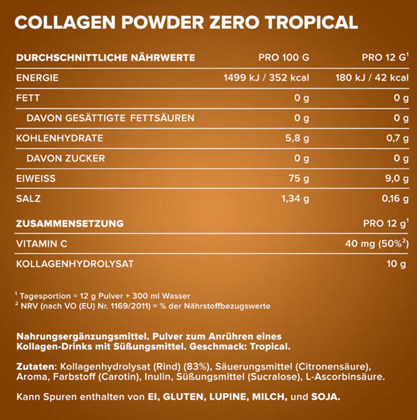 A kollagént általában maga az emberi szervezet tudja előállítani. Az életkor előrehaladtával azonban a szervezet saját termelése jelentősen csökken, ezért gyakran hiánytünetek jelentkeznek. Ezek a hiányosságok általában ízületi fájdalom formájában hívják fel magukra a figyelmet, de gyakran az izmok rugalmasságának elvesztését és a bőr ráncosodását is okozzák. Ha hatékonyan szeretné ellensúlyozni ezeket a tüneteket, ajánljuk a kiváló minőségű Collagen Powder Zero 250g IronMaxx®-ot. Ez egy nagy dózisú kollagén hidrolizátum por formájában, amelyet vízzel kell összekeverni. Ezt a kollagént a finom trópusi és zöld tea-citrom ízekben fogyaszthatod.