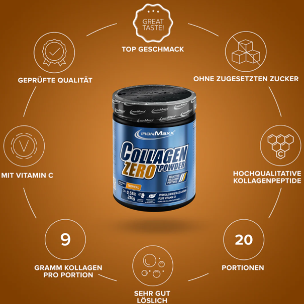 A kollagén nem más, mint egy összetett fehérje, mely elsősorban a kötőszövetekben (többek között a bőr alsó rétegében), inakban, izomszalagokban, csontokban, ízületekben, hajban és a fogakban fordul elő. A kollagén 30%-os előfordulási arányával, az emberi szervezetben leggyakrabban előforduló fehérje, mely nagyon leegyszerűsítve a jó formáért és stabilitásért felel a szervezetben. A kollagén ellenálló ún. szuperhélix szerkezete gondoskodik a bőr, a csontok, a porcok, az ínak és izomszalagok kötőszöveteinek feszességéről. A kollagénben gyakran előfordul a glicin, prolin és hidroxiprolin aminosav-kombináció. Ezen aminosavak különleges szerkezete egy kimondottan merev struktúrát eredményez, melynek következménye a feszes bőr, kemény csontozat, erős ízületek, dús haj, egészséges ínak és izomszalagok. A fentiekben felsorolt számos pozitív hatás elősegítésének, valamint a hiánytünetek megelőzésének érdekében kimondottan ajánlott a Collagen Powder Zero 250g IronMaxx® táplálékkiegészítő fogyasztása.