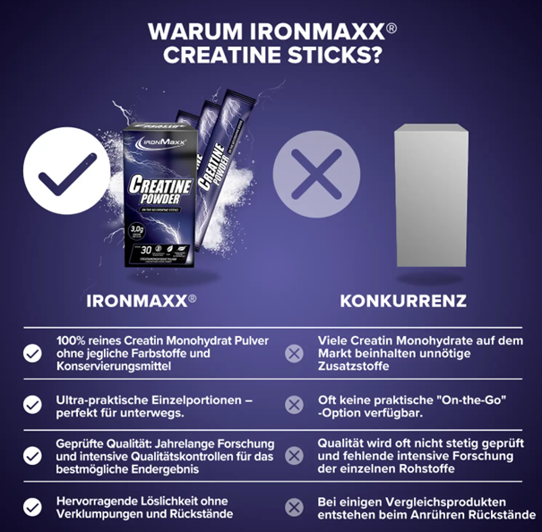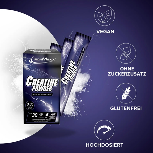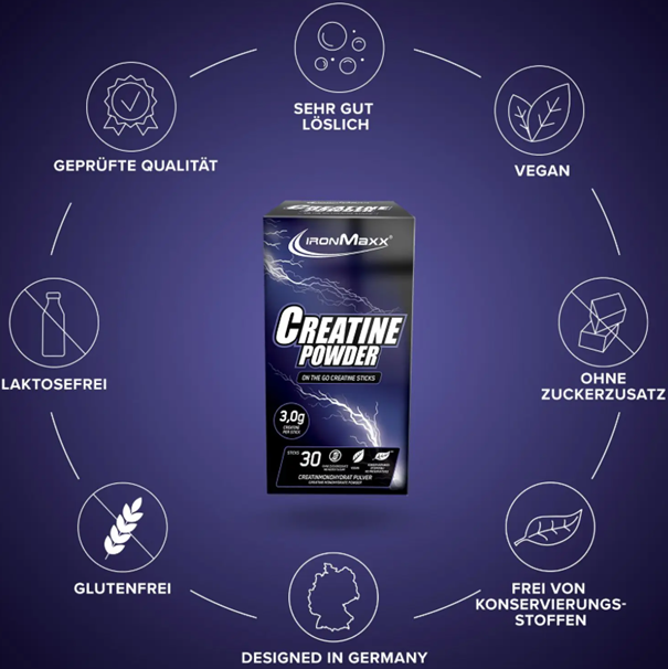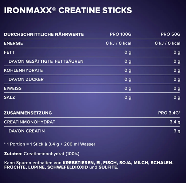 Akár izomépítésről, erőnléti edzésről vagy intenzív edzésfázisokról van szó – a Creatine Monohydrate Sticks (30 x 3,4 g) IronMaxx® a tudatos étrend praktikus megoldása.