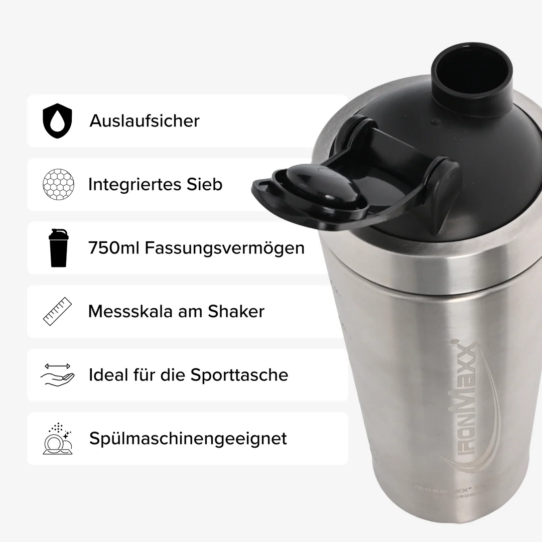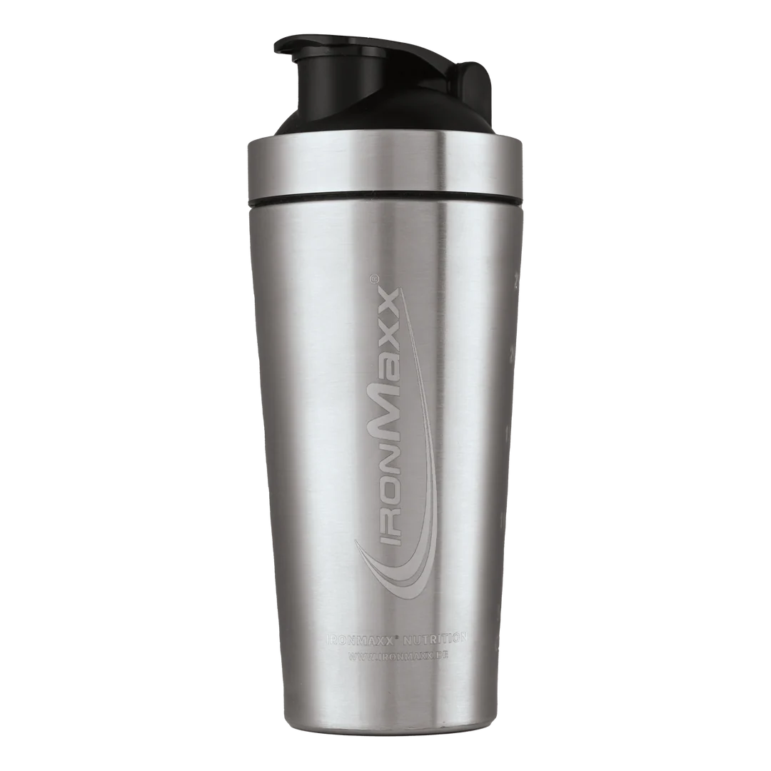 A Fém Shaker-750ml IronMaxx® elegáns rozsdamentes acél megjelenésével, robusztus konstrukciójával és bőséges, 750 ml-es űrtartalmával lenyűgöző. Ideális fehérje, esszenciális aminosav vagy más edzés előtti italok keveréséhez – csomósodás nélkül. A Fém Shaker-750ml IronMaxx® teljesen szivárgásmentes, szagtalan és mosogatógépben mosható. Nem folyik ki, nem kell kézzel öblíteni, nincs műanyagszag – csak stílusos dizájn és kompromisszumok nélküli funkcionalitás. Akár edzőteremben, útközben vagy otthon: ez a shaker igazi tekinteteket gyönyörködtető és mindennapi használatra is alkalmas.