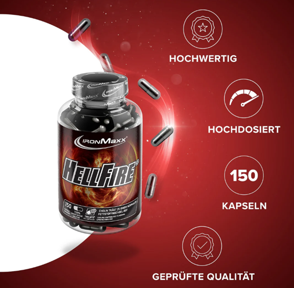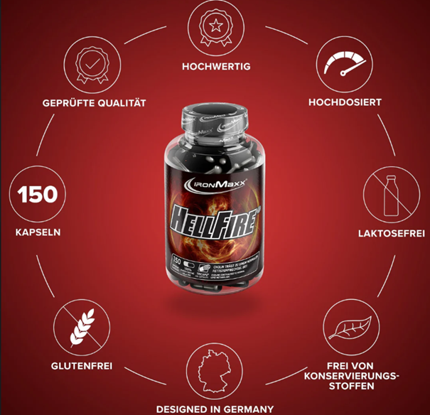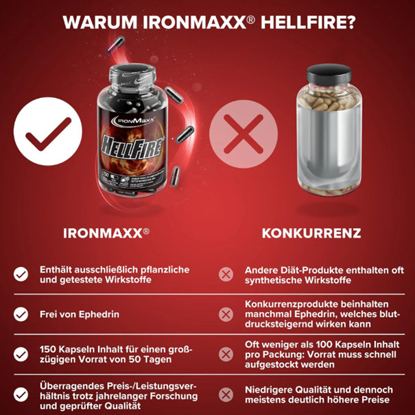 A Hellfire® Fatburner IronMaxx® teljesen ártalmatlan*/*, kizárólag növényi alapanyagokat tartalmaz, nincsenek mellékhatásai és efedrin nélkül támogatja az anyagcserét.