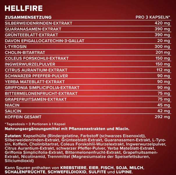 A Hellfire® Fatburner IronMaxx®-ben felhasznált hatóanyagok – zöld tea, Yerba maté tea, guarana és keserű narancs – jellemzően nagy mennyiségben tartalmaznak koffeint és más anyagcserét fokozó anyagokat. A koffein egy stimuláns, amely serkentőleg hat a pszichére, a koncentrációs képességre, csökkenti a fáradtságot és a szervezet hőtermelését is fokozza. A gyömbér-, paprika– keserűdinnye– és grapefruit-kivonat szintén az anyagcsere természetes módon való fokozásáról gondoskodnak. Ezen kívül a fűzfakéreg-kivonat komplex hatóanyagainak vérhígító hatása által biztosítja a zsírszövetek megfelelő vérkeringését és anyagcseréjét. A mentális aktivitásról az L-tirozin és a feketebab-kivonat gondoskodnak, amelyek közismertek hangulatjavító hatásukról.