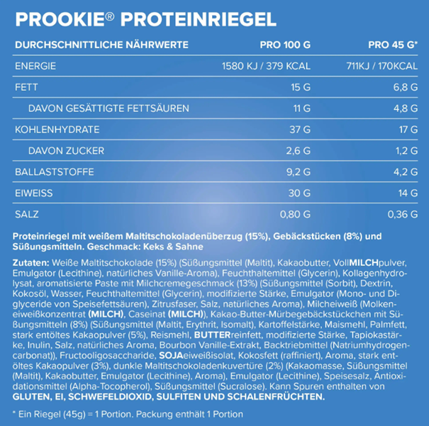 Krémes állaga, ropogós külső a valódi kekszdaraboknak és a fehér csokoládé bevonatnak köszönhetően, a Prookie Protein Bar 45 g – IronMaxx® mindössze 1,2 g cukrot tartalmaz szeletenként – a tudatos étrend részeként, az íz feláldozása nélkül.