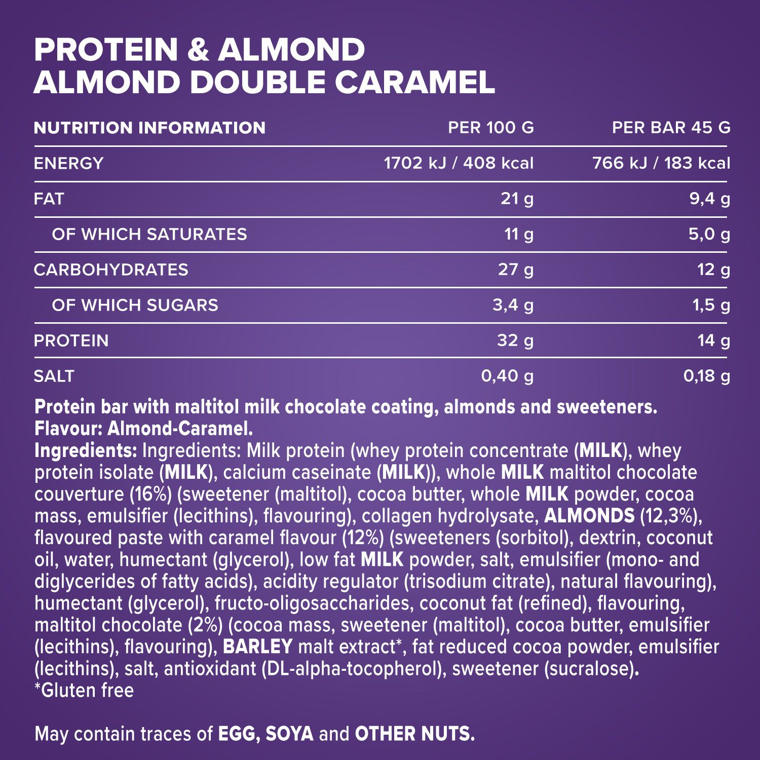 Összetevők: Tejfehérje (tejsavófehérje-koncentrátum ( TEJ ), tejsavófehérje-izolátum ( TEJ ), kálcium-kazeinát ( TEJ )), maltit-os teljes TEJ csokoládéöntvény (16%) (édesítőszer (maltitol), kakaóvaj, teljes TEJpor , kakaómassza, emulgeálószer (lecitinek), aroma), kollagén-hidrolizátum, MANDULA (12,3%), karamell ízű ízesített paszta (12%) (édesítőszer (szorbitol), dextrin, kókuszolaj, víz, nedvesítőszer (glicerin), sovány TEJPOR , só, emulgeálószer (zsírsavak mono- és digliceridjei), savanyúságot szabályozó anyag (nátrium-citrát), természetes aroma), nedvesítőszer (glicerin), fruktooligoszacharidok, kókuszzsír (finomított), aroma, maltit-os csokoládéöntvény (2%) (kakaómassza, édesítőszer (maltitol), kakaóvaj, emulgeálószer (lecitinek), aroma), ÁRPA malátakivonat, magasan zsírszegény kakaópor, emulgeálószer (lecitinek), só, antioxidáns (DL-alfa-tokoferol), édesítőszer (szukralóz).