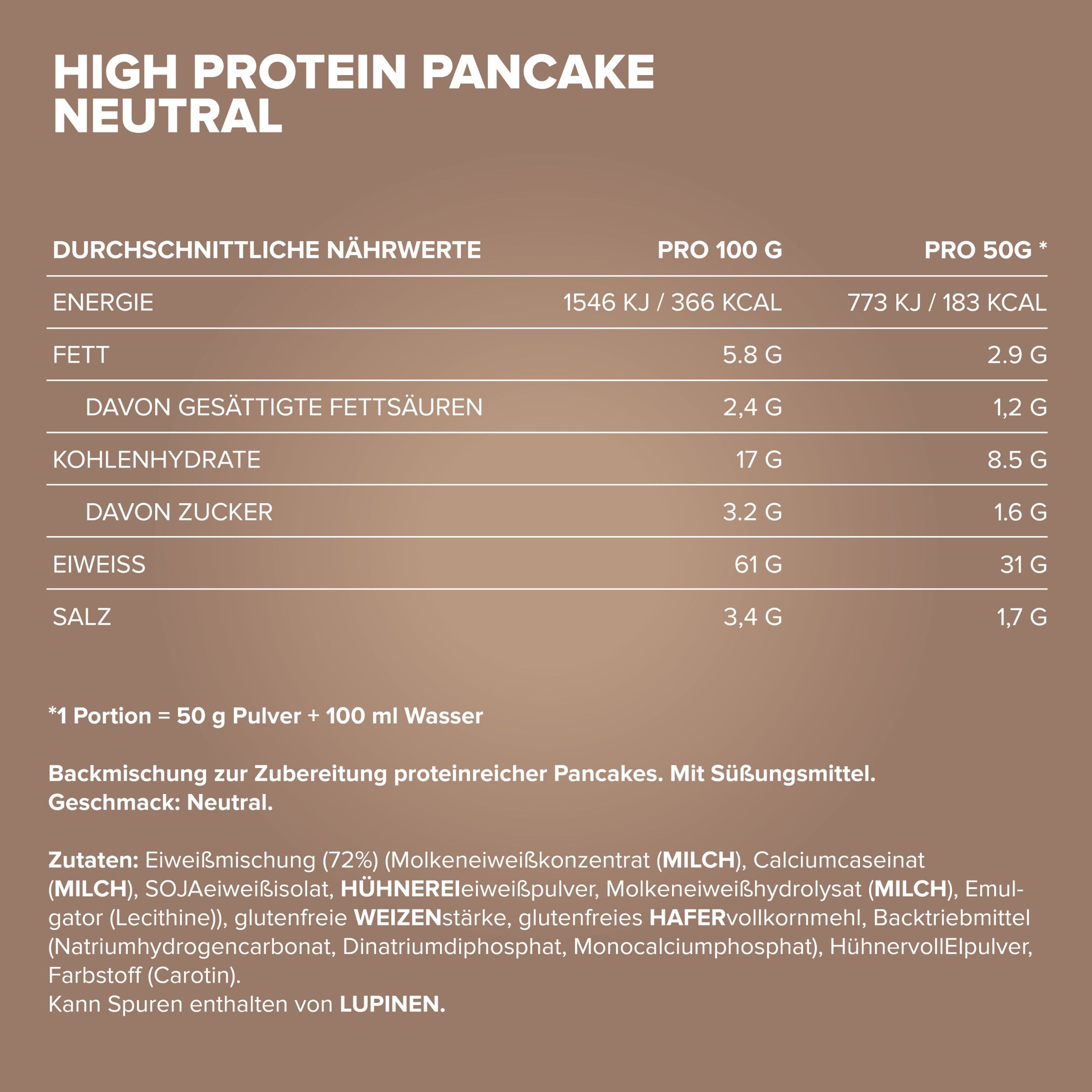 Elkészítési és fogyasztási javaslat: Keverj össze 50 g Protein Pancake 450 g Doboz – IronMaxx® port (2 Mérőkanál)+ 150 g hideg vizet tésztává, majd közepes hőmérsékleten süsd meg egy serpenyőben.